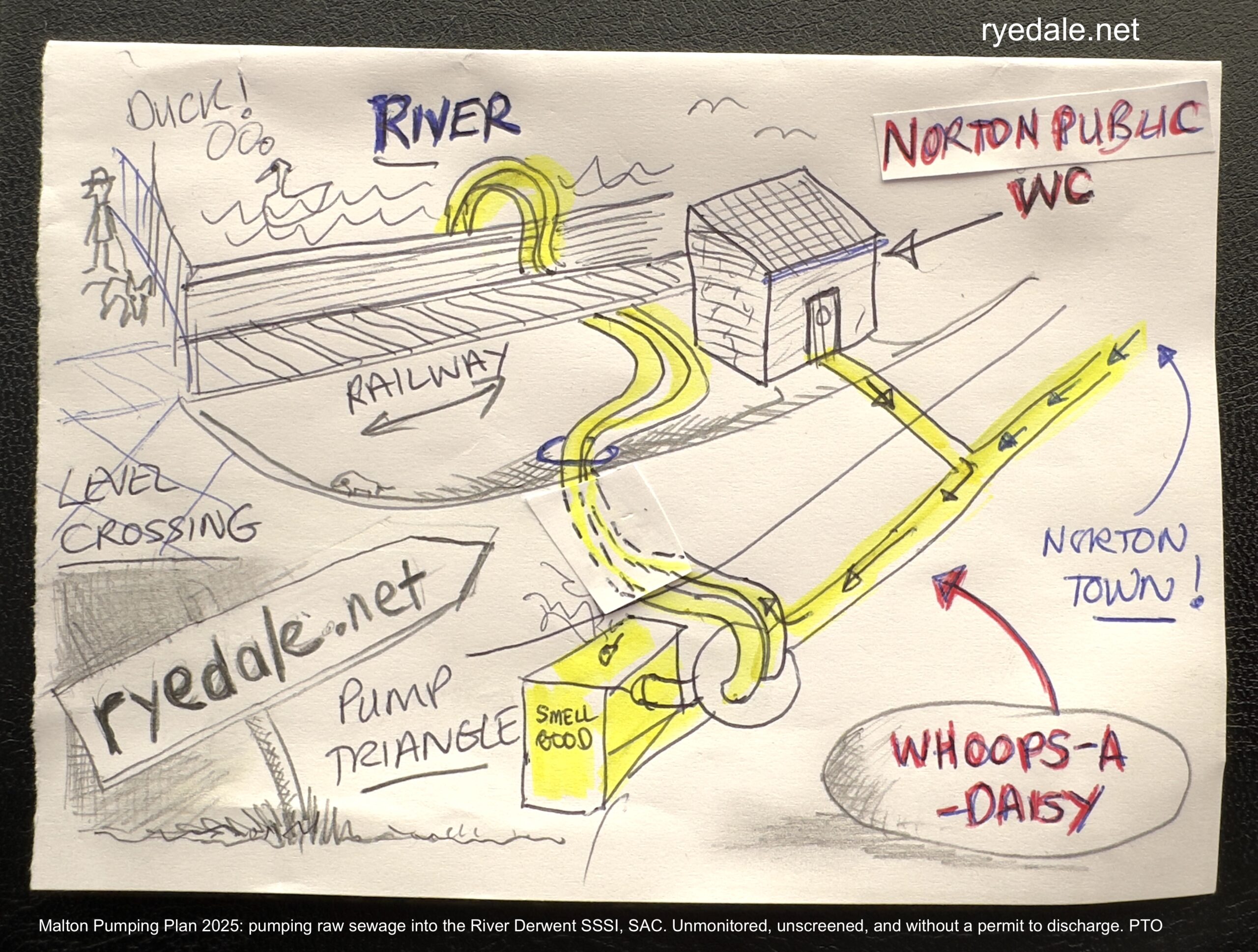 A lack of hydraulic capacity in the Malton, Norton and Old Malton sewerage system (there is only one system), including lack of pumping station capacity (coupled with badly designed flood defence walls constructed by the Environment Agency in 2003) means the ‘partnership’ has resorted to pumping combined sewage directly over the flood walls into the river. Welcome to the North Yorkshire version of Hogarth’s London. We live next to an open sewer, where even the contents of the Norton public conveniences are pumped directly into the River Derwent SSSI, SAC. It’s free to pee and pollute the river!
